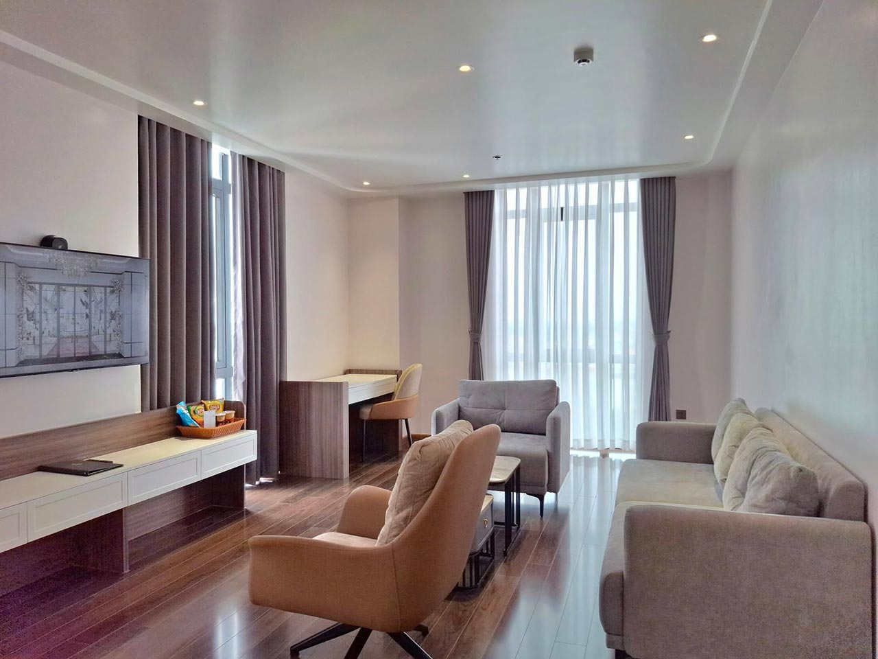 Phòng Suite hai phòng ngủ gồm 1 giường to và hai giường nhỏ hoặc 4 giường nhỏ là sự lựa chọn lý tưởng cho những nhóm hoặc gia đình yêu thích không gian nghỉ ngơi thoáng đãng và gần gũi với thiên nhiên. Với thiết kế tinh tế, phòng bao gồm khu vực ngủ tiện nghi, phòng tắm riêng hiện đại, rộng rãi – nơi bạn có thể thư giãn, đọc sách hoặc thưởng thức cà phê sáng. Trang bị đầy đủ điều hòa, TV màn hình phẳng, tủ quần áo, két an toàn và ấm đun nước điện, phòng mang đến trải nghiệm nghỉ dưỡng thoải mái và riêng tư trong không gian sang trọng.